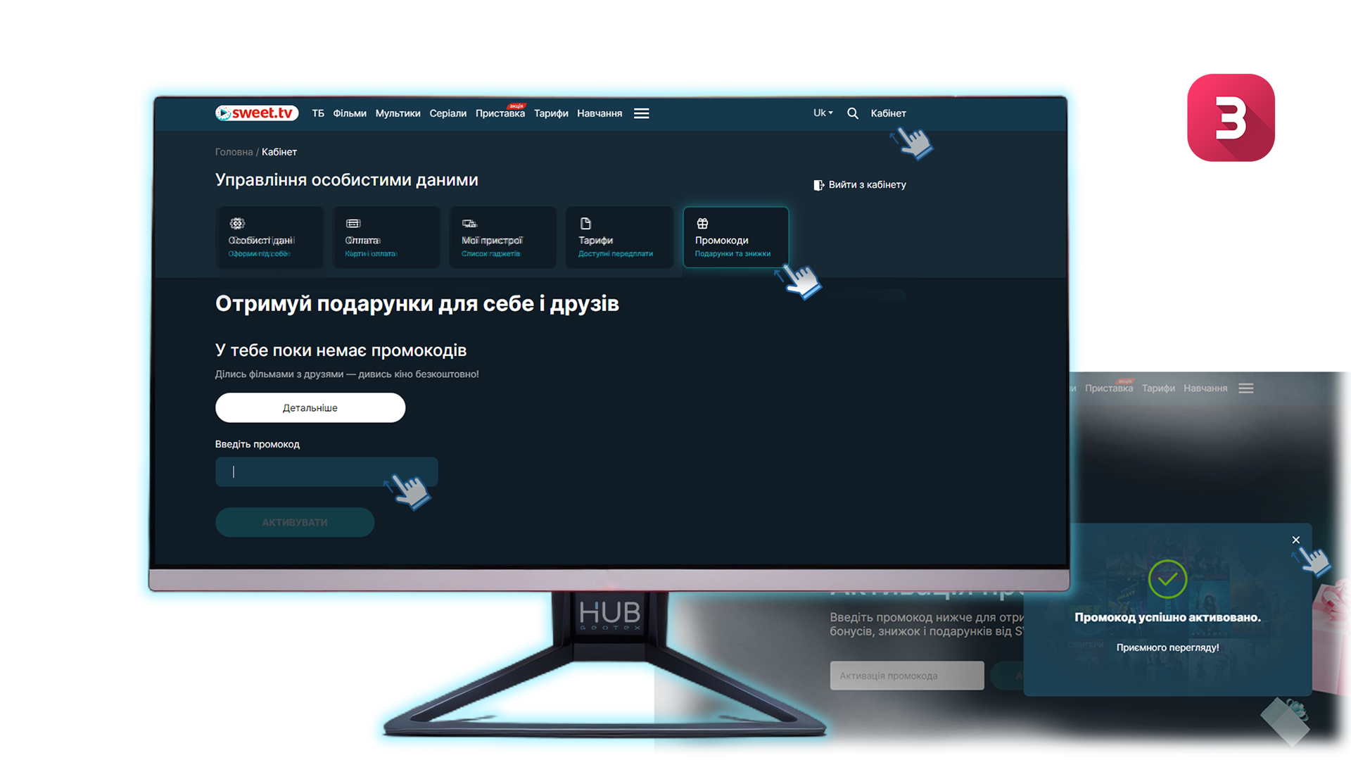 Наприклад, за допомогою сервісу "Безкоштовні промокоди" від GTX HUB - ви з цим кодом можете активувати 1 місяц перегляду Sweet.tv.